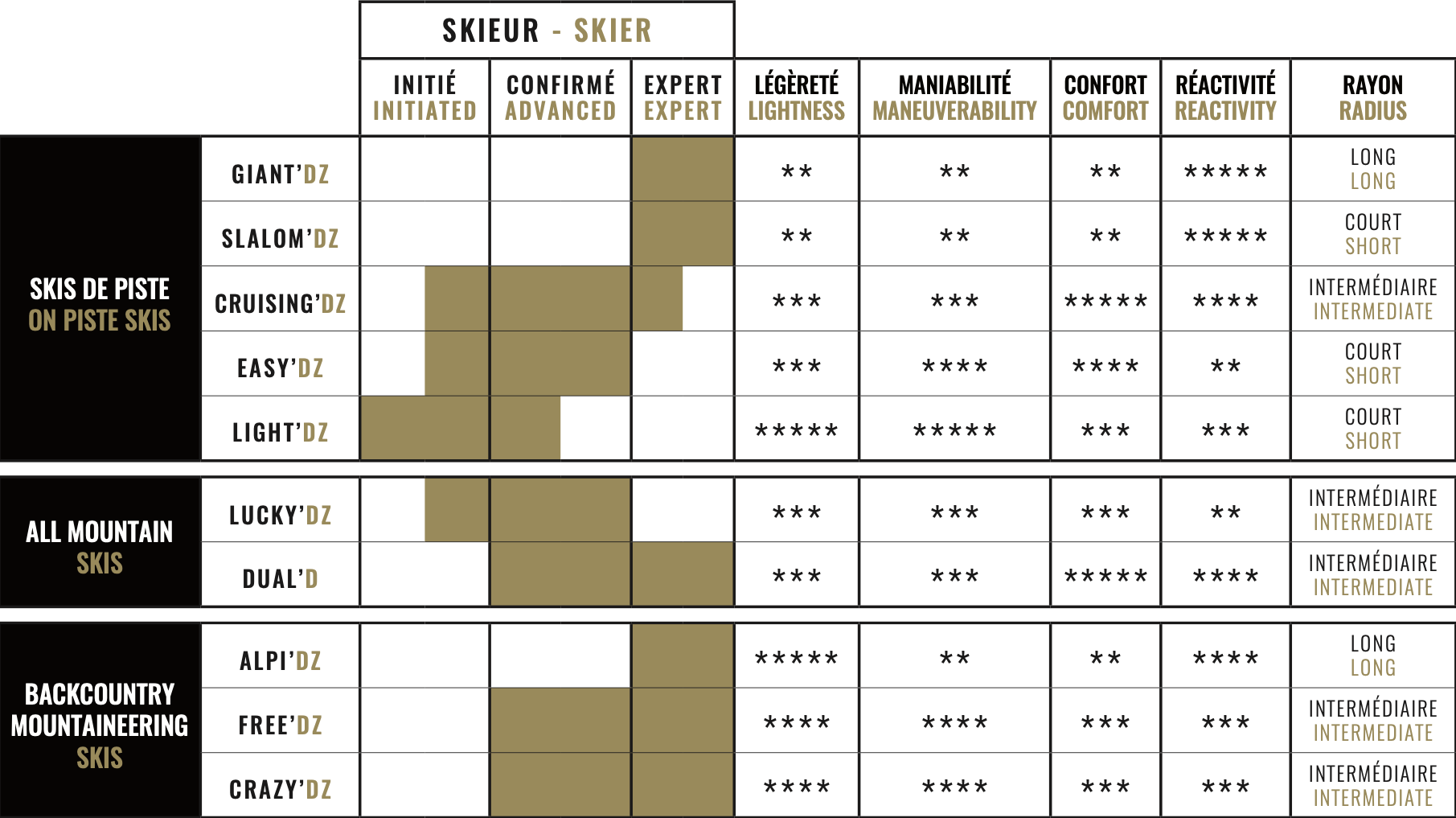 Giant'DZ, Slalom'DZ, Cruising'DZ, Easy'DZ, Light'DZ